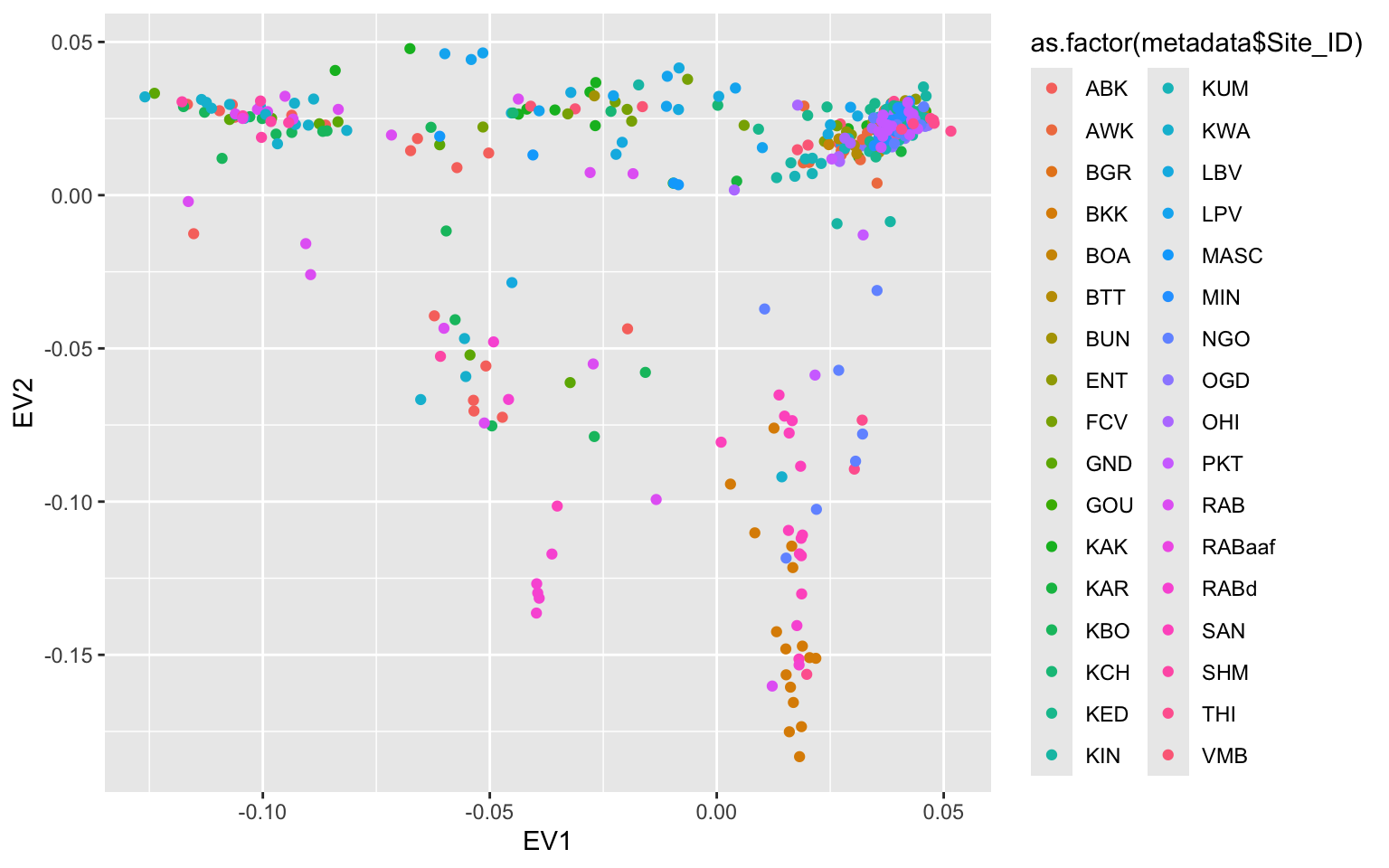 EV10=pca.mosq$eigenvect[,10])We then need to check that our metadata and our PCA data are identical and that Sample ID in both datasets match, so let’s match them up with that!