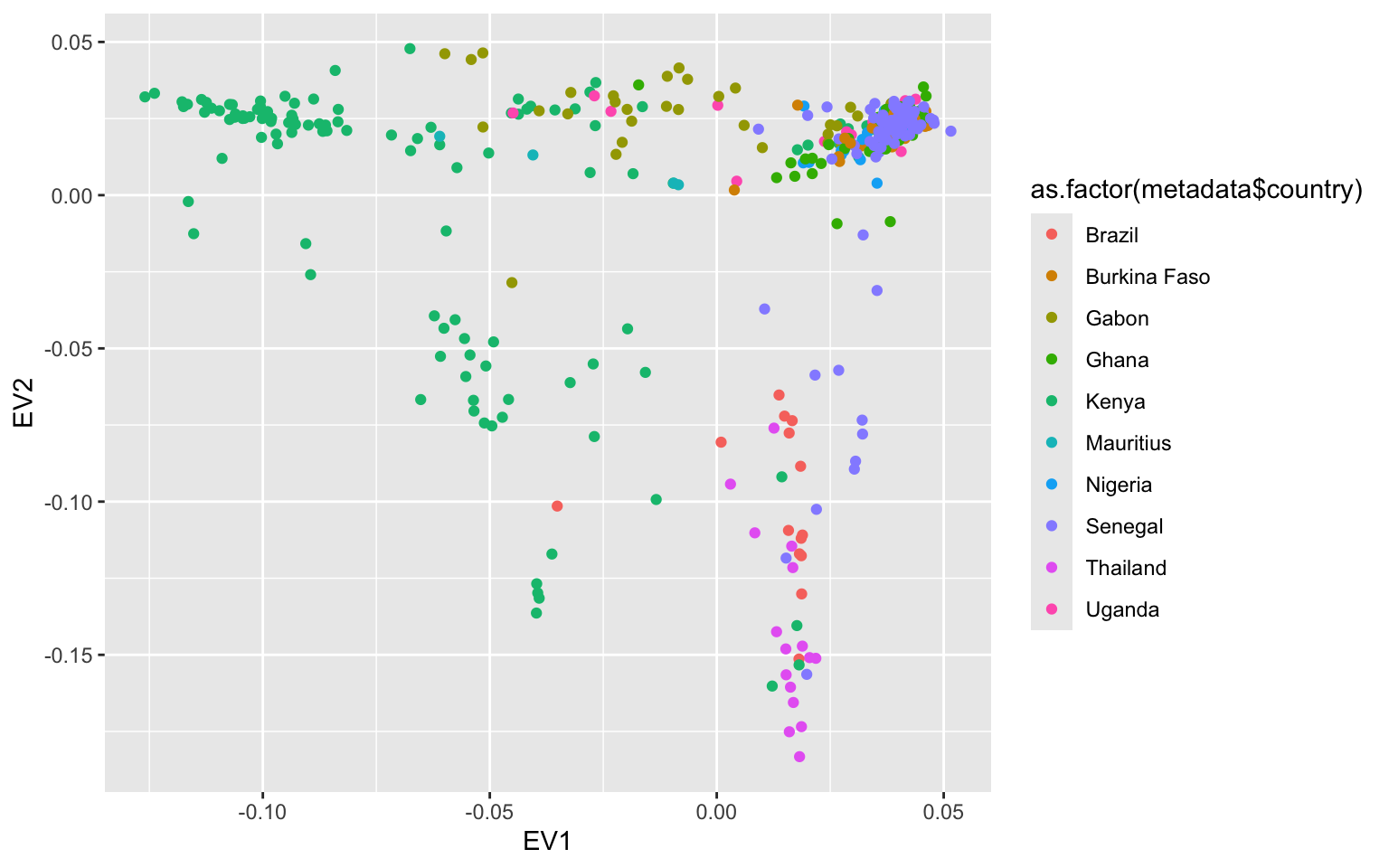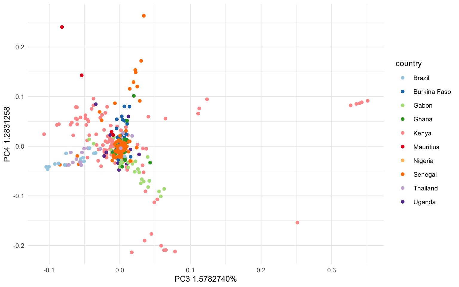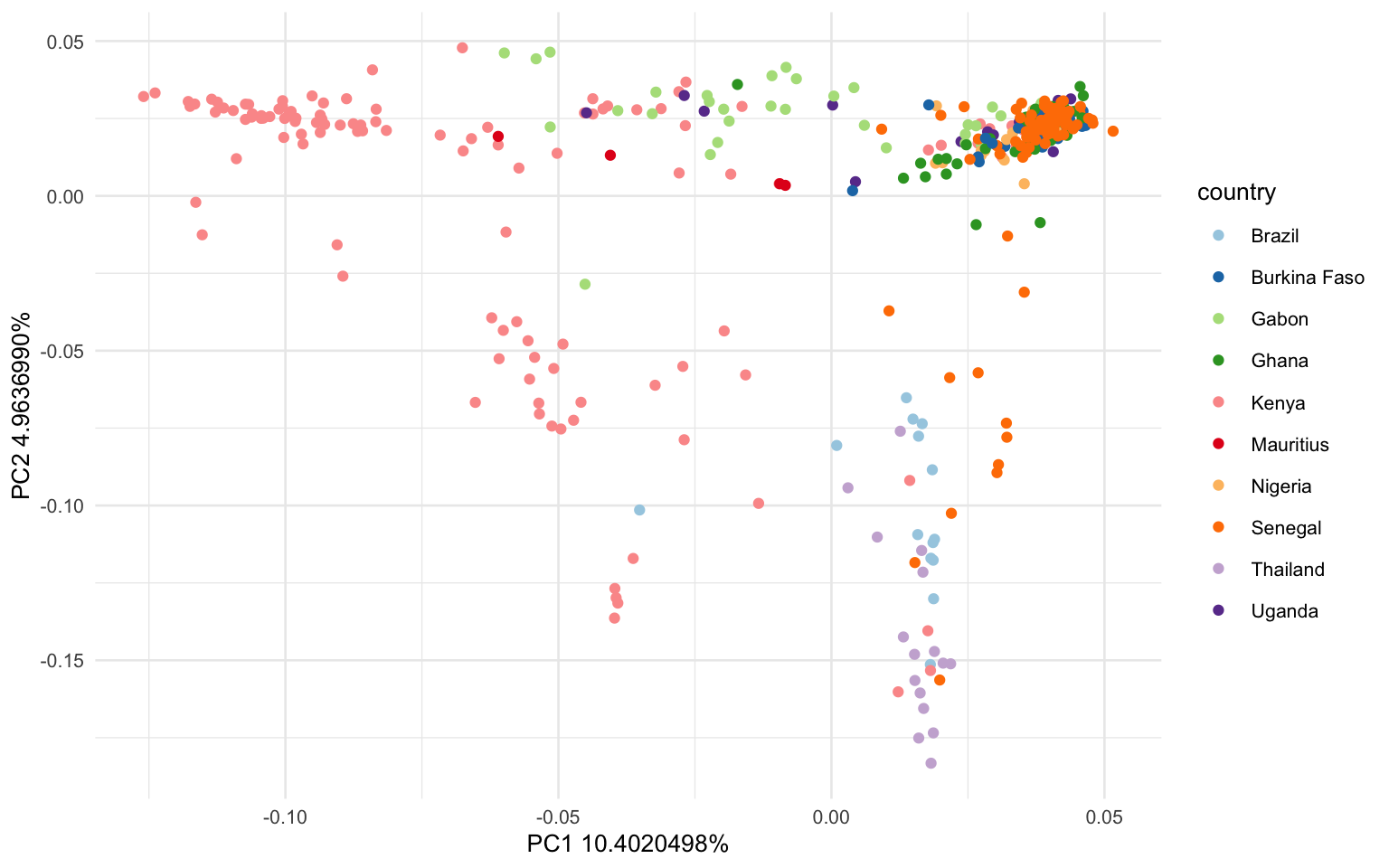 PairedorSet3if you are using RColorBrewer so there are enough colors) and make sure to change the axis labels.Q2) In the paper, the authors plotted their PCA by region rather than country. Add a new column to your metadata for region and replot PC1 vs PC2. Code Thailand and Brazil as “America/Asia”. West Africa includes Senegal, Burkina Faso, Ghana and Nigeria. Central Africa includes Gabon and Uganda. For simplicity sake, code all of the Kenyan sites as Coastal East Africa along with Mauritius (although in the paper Kenya spans both the Central Africa and Coastal categories).