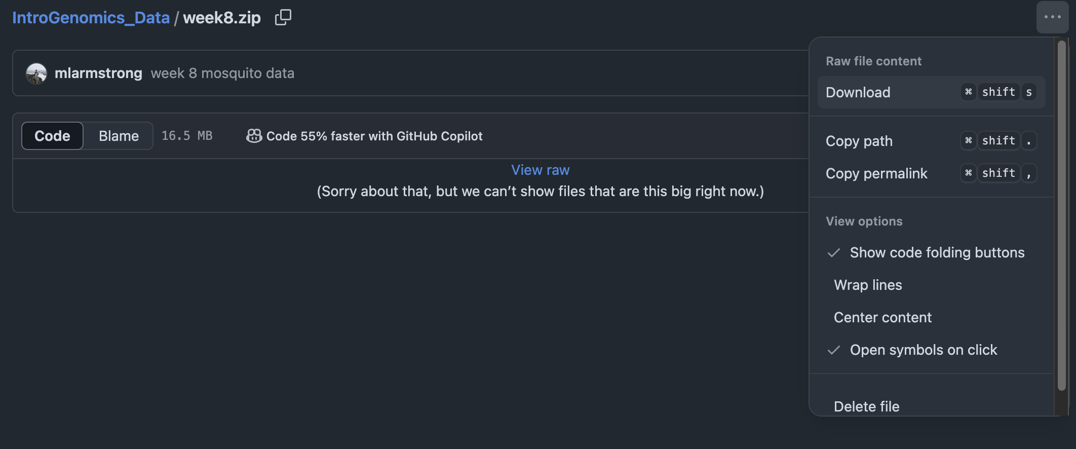Then download the data directly from the class data github: https://github.com/mlarmstrong/IntroGenomics_Data First click week8.zip and then click the three dots at the top to download.