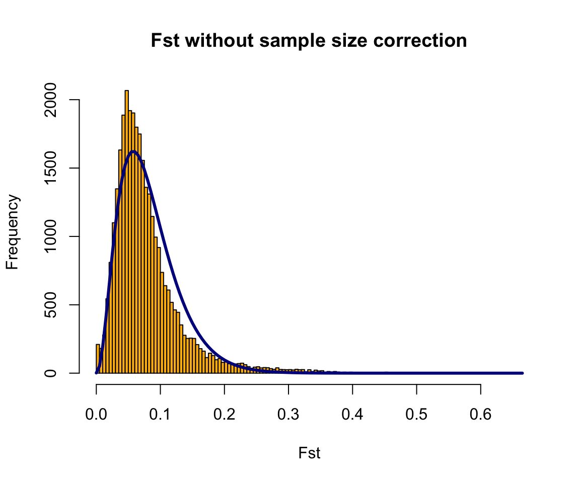 Once we’ve calculated Fst between the two populations for each SNP individually, we want to determine whether some SNPs are outliers - that is, more differentiated than we would expect. OutFLANK does this by fitting a Chi-Squared distribution to the data and looking to see if the tails of the Chi-Squared distribution have more SNPs than expected: