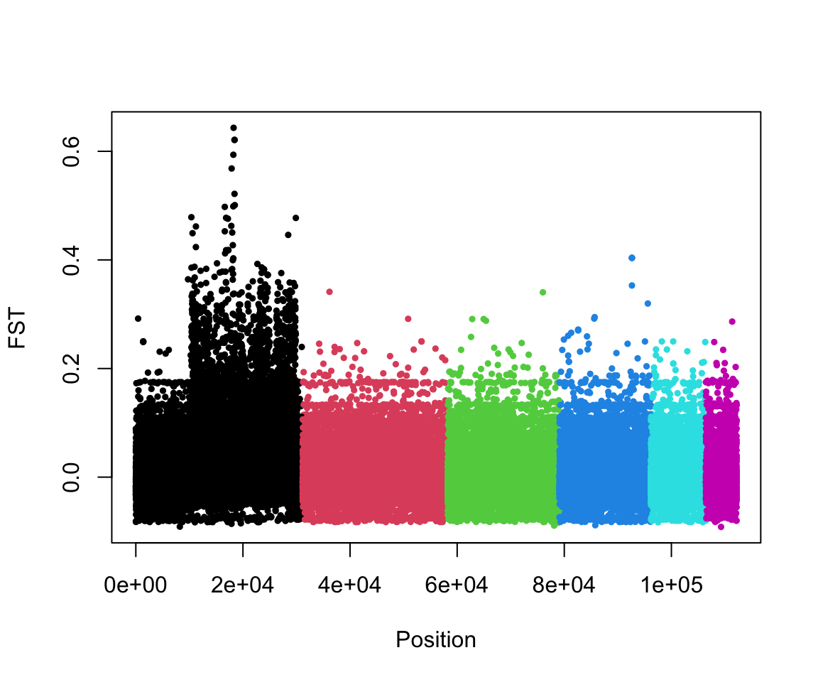 Now we can make a manhattan plot! There are lots of packages to make very beautiful manhattan plots and even highlight particular genes of interest. Here we will just use base R. First, take a look at the dataframe that has information on Fst and outliers: